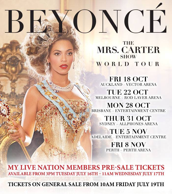 Beyoncé has officially announced her Australian tour dates on the Mrs Carter Show World Tour, with the Single Ladies announcing shows in Brisbane, Sydney, Melbourne, Adelaide and Perth in October and November 2013.