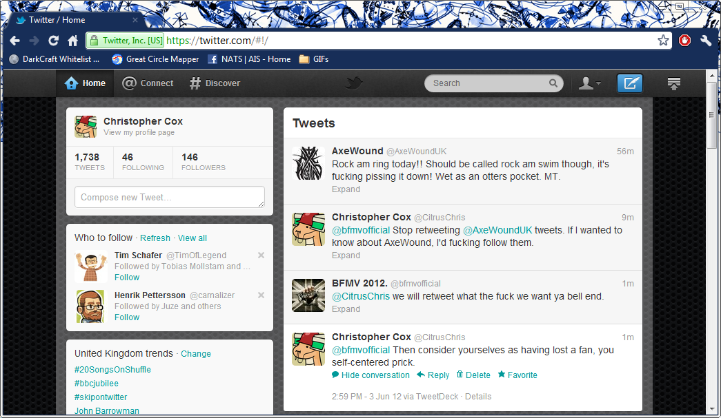 Tuck responded through the Bullet For My Vallentine account with: “we will retweet what the f**k we want ya bell end,” and then quickly logged onto the AxeWound account, tweeting CitrusChris with “nob.”
