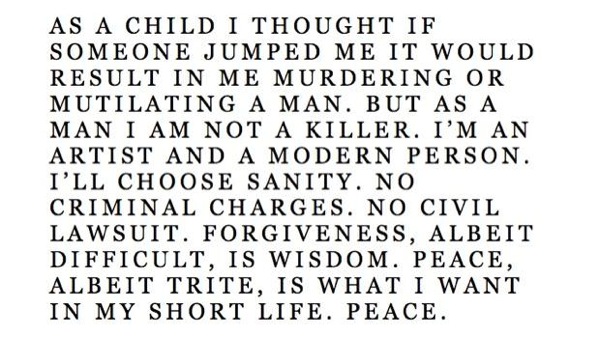 “As a child I thought if someone jumped me it would result in me murdering or mutilating a man. But as a man I am not a killer. I’m an artist and a modern person. I’ll choose sanity. No criminal charges. No civil lawsuit. Forgiveness, albeit difficult, is wisdom. Peace, albeit trite, is what I want in my short life. Peace.”