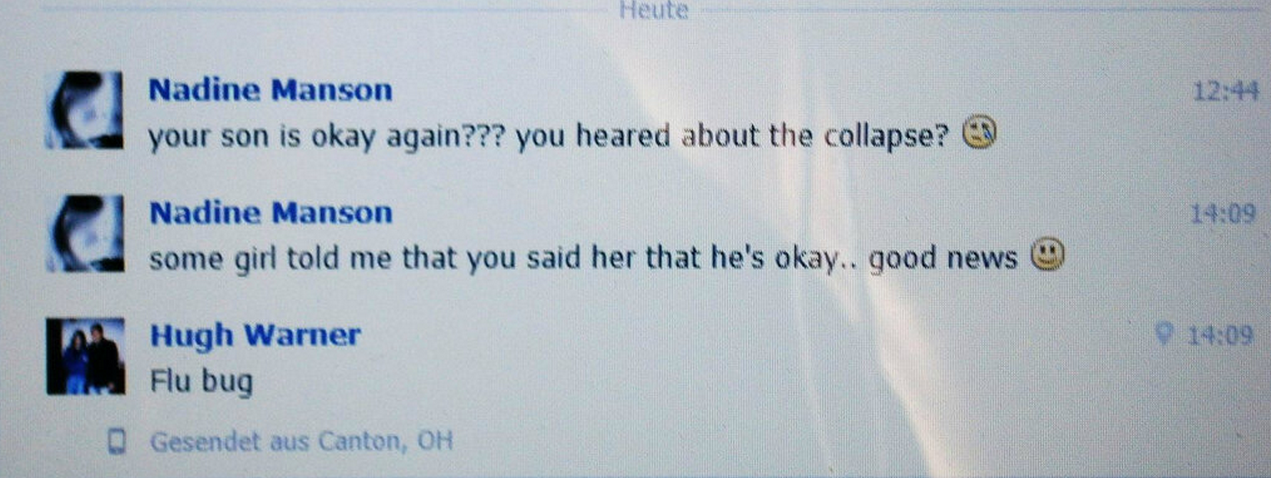Apparently Manson was ill all day but refused to cancel his performance. Following his onstage collapse Manson was not taken to hospital but rather recuperated in his hotel room. Manson’s father, Hugh Warner, confirmed his son has the ‘flu bug’ when contacted by a distressed fan.